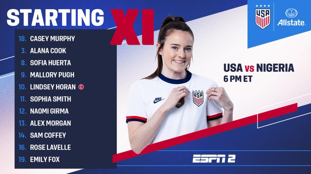 Starting XI vs. Nigeria: 18-Casey Murphy; 3-Alana Cook, 8-Sofia Huerta, 9-Mallory Pugh, 10-Lindsey Horan, 11-Sophia Smith, 12-Naomi Girma, 13-Alex Morgan, 14-Sam Coffey, 16-Rose Lavelle, 19-Emily Fox