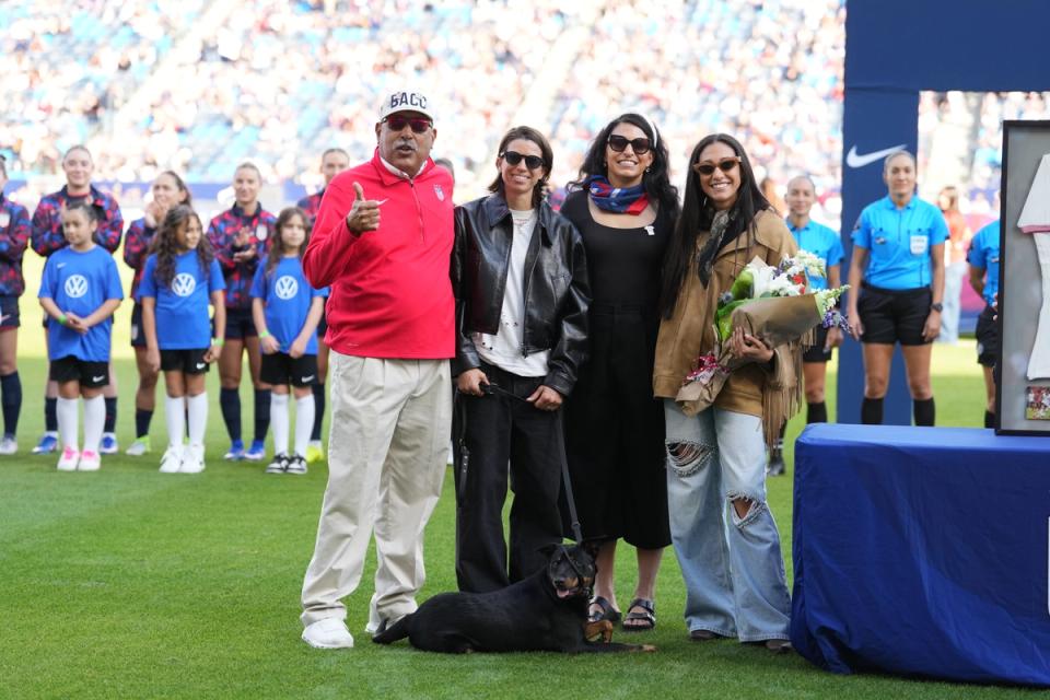 Retired USWNT player Christen Press (right) is honored with her father Cody Press, her sister Tyler Press, and wife Tobin Heath prior to the USWNT match against Pararguay in Carson, California. (Photo by Brad Smith/ISI Photos/USSF/Getty Images)